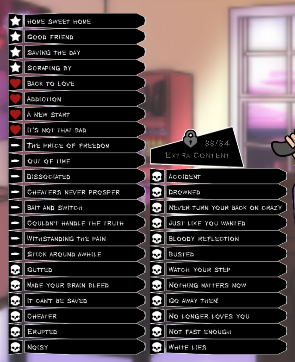 hai guys, i hope you're well! so i've been playing this for like.. .three months lol, i just finished adam, walter, sebastian and stalker route but i need the ''no more love'' ending from rebecca and the achievment ''the ugly truth'' from damien if someone could help i really would be so glad ^^